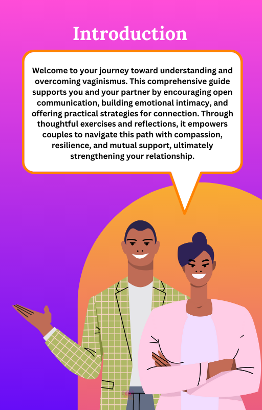 This comprehensive guide is designed to support partners navigating the challenges of vaginismus by fostering open communication, building emotional intimacy, and providing practical strategies for connection. Emphasizing empathy, patience, and understanding, it helps couples work together to overcome obstacles, strengthen their relationship, and enhance their connection through thoughtful exercises and insights, empowering them to navigate this journey with compassion and resilience.